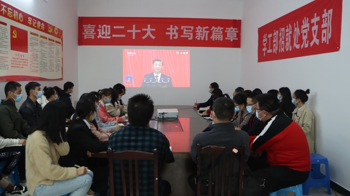 10月16日上午,举世瞩目的中国共产党第二十次全国代表大会在北京人民大会堂隆重开幕。学工部招就处党支部组织党员、入党积极分子及挂靠学生处的学生社团骨干,在众创空间102室集中收听收看党的二十大开幕会,其余职工通过网络、电视、广播等渠道收听收看了开幕会盛况。