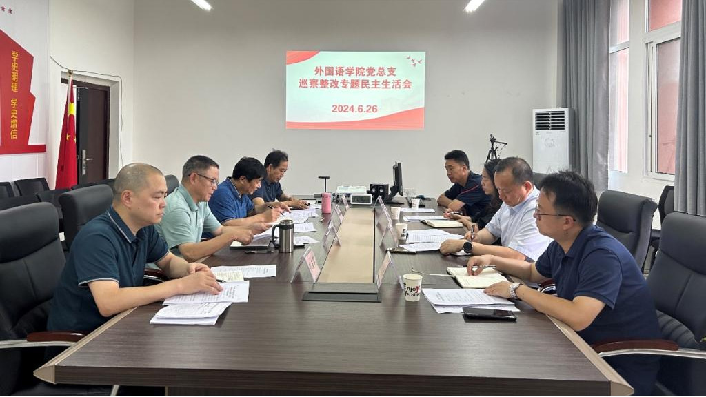 6月26日下午,外国语学院党总支召开巡察整改专题民主生活会。会议由学院党总支书记甘长银主持,学院全体班子成员参会,学校党委常委、副校长聂祥飞,学校党委巡察领导小组成员列席会议。