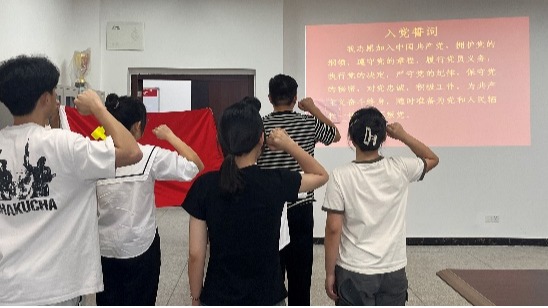 在领誓人程航同志的带领下,新党员们举起右拳,面向党旗,庄严宣誓,表达了他们为共产主义事业奋斗终身的决心和信念。宣誓完毕后,新党员们纷纷表态将牢记党的宗旨,严格遵守党的纪律,不断提高自身素质,为党的事业贡献自己的力量。他们的话语中充满了对党的热爱和对未来的憧憬,也展现出了新时代大学生的责任与担当。