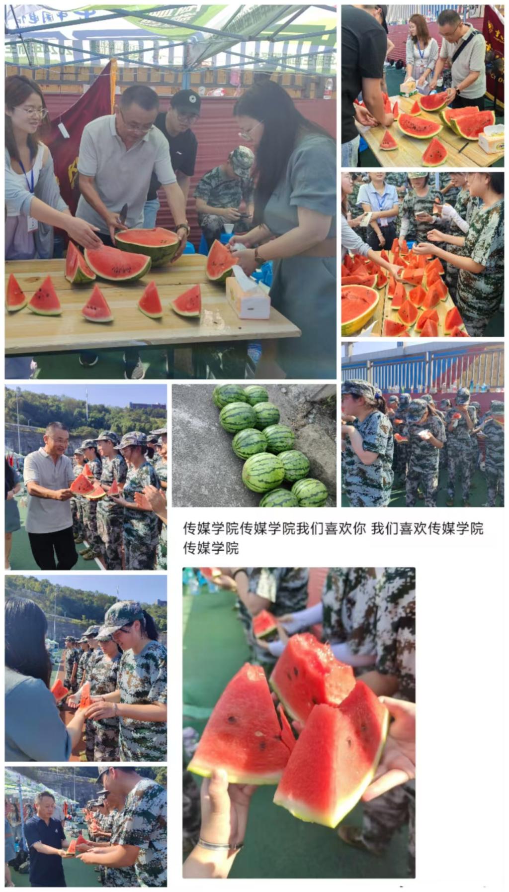 为军训学生送“解暑剂”。当前,学院260名2024届新生的军训正在火热进行,9月14日上午,学院精心挑选的200余斤解暑西瓜送进了军训场地,给学院军训学子们带来一份“清凉”。学院领导深入军训场地,与军训新生们进行亲切的交流,详细询问了他们的训练情况,对大家能够克服困难、坚持训练表示赞赏,为他们送上了诚挚的关怀和问候。慰问现场,学院党总支副书记、院长韩红宇为同学们切好西瓜,党总支书记孙国英、副院长陈振华将西瓜递到同学们手中。当甜甜的西瓜吃到嘴里,学院军训学子们成了训练场最欢乐的一群人,他们表示:“给学院的‘送关怀送清凉’活动点赞!”“这西瓜太甜啦!学院太贴心啦!”。西瓜送清凉,关怀沁人心,学院领导为军训学子们及时送来的“解暑剂”,让刚入大学的他们感受到了传媒大家庭浓浓的爱,让他们能够以更加饱满的精神状态接受军训的考验。