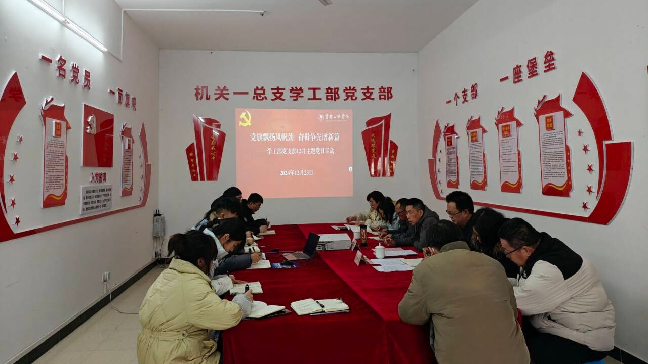 2024年12月23日,学工部党支部在众创空间102召开党员大会,举行“党旗飘扬风帆劲,奋楫争先谱新篇”主题党日。学校党委常委、副校长尹立孟参加活动,一起分享学习体会,深入开展交流研讨,共同抓好理论学习。