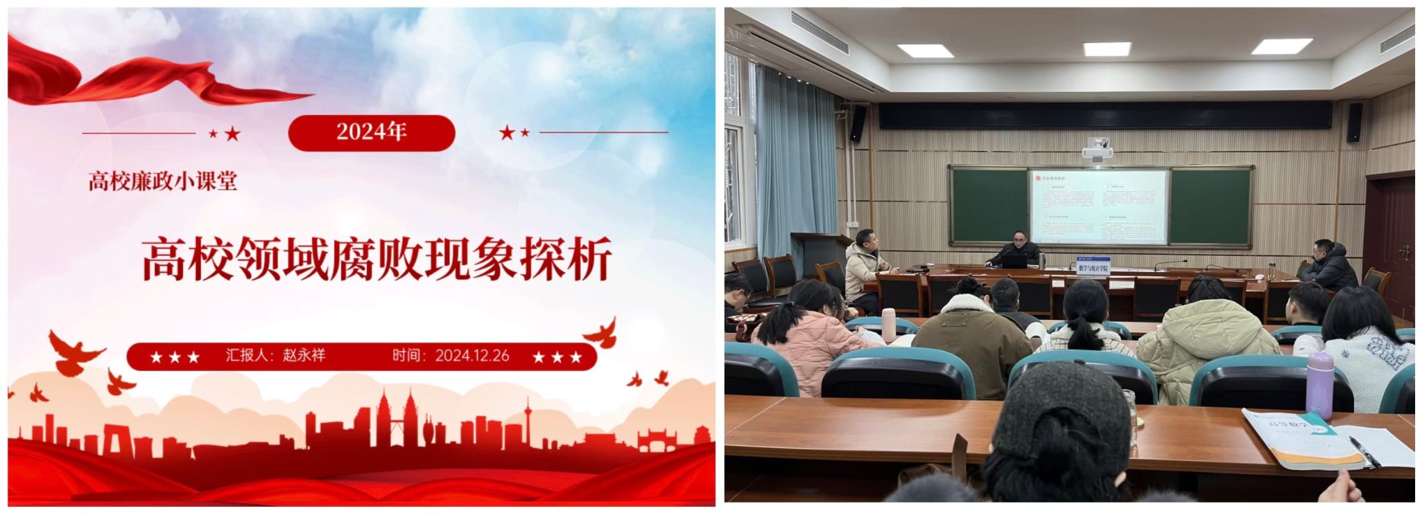 为深入推进全面从严治党,推进清廉学校建设,2024年12月26日,数学与统计学院在明辨楼1-104室集中开展党风廉政教育,学院全体教职员工参加本次教育活动。
