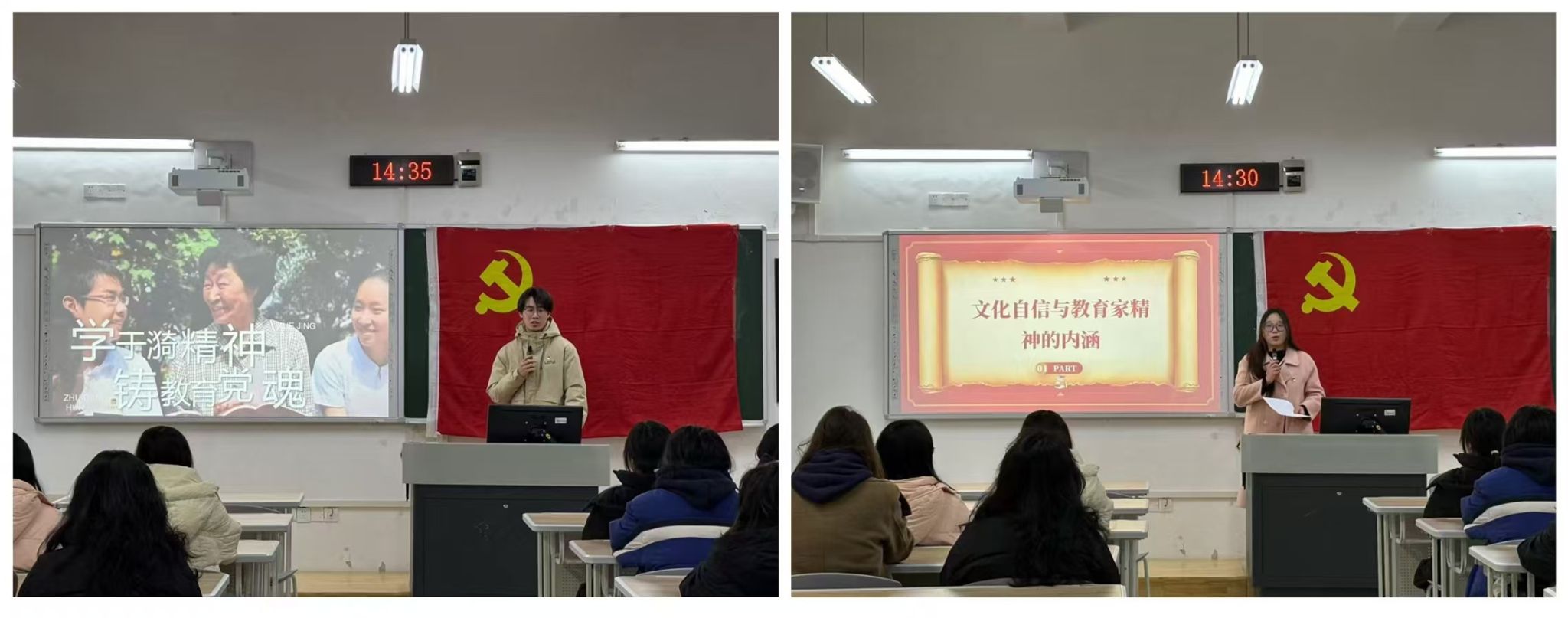 接着,党员代表余宏同志、刘东同志、陈嘉倩同志进行领学。余宏同志带领大家学习了教育家精神的核心内涵,并鼓励同志们积极践行教育家精神,为教育事业发展贡献力量;刘东同志以人民教师于漪的事迹为切入点,以生动鲜活的事例使同志们进一步明确了教育家精神的践行之道;陈嘉倩同志从文化自信与教育家精神的内涵入手,分享了人民教育家黄大年的生动事迹。