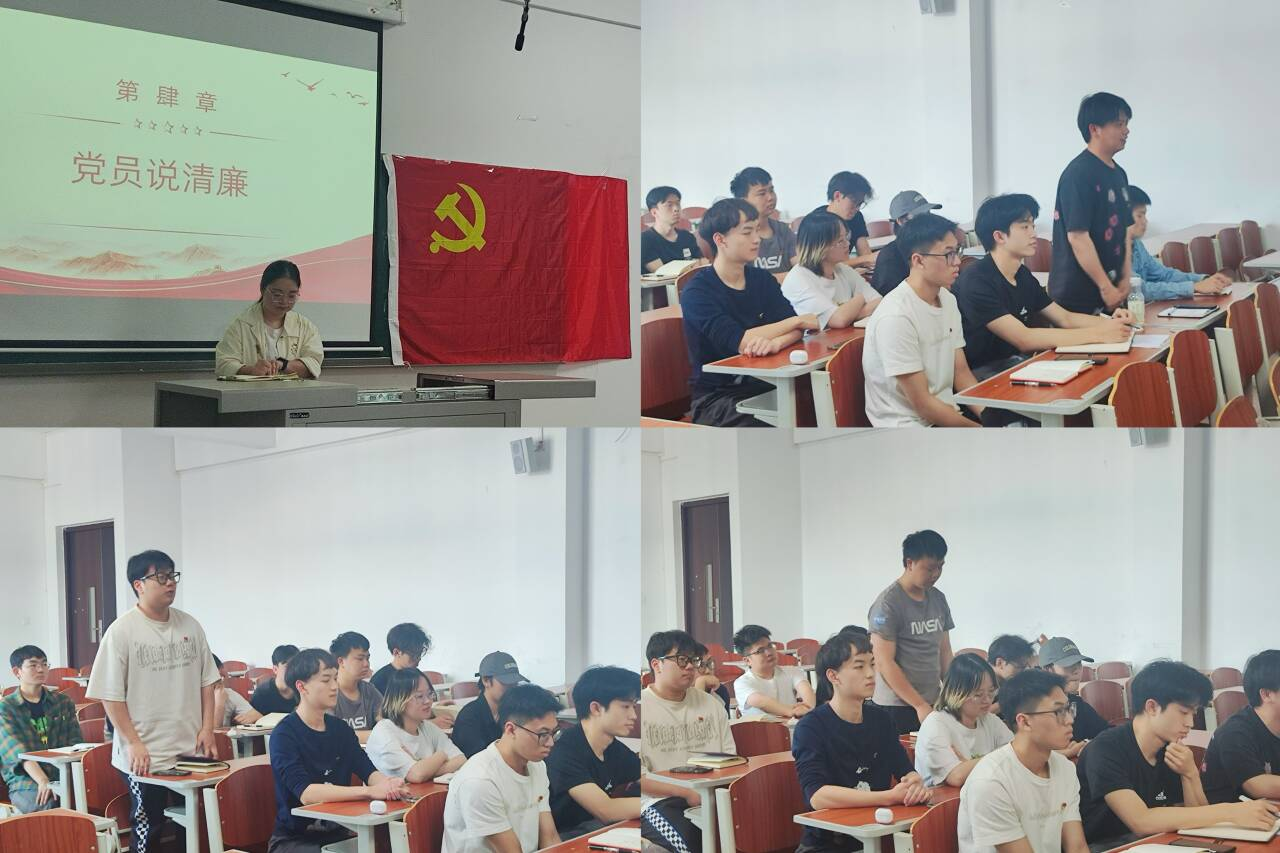 在党员“说”清廉环节中,学生党员们结合自身情况依次发言。党员童凡涛谈到要深知学术研究的严谨性与重要性,遵守学术规范,以高度的责任感和使命感,营造风清气正的学术环境;党员苏崇扬表示,即将走上工作岗位,将时刻以贪腐实际案例为警醒,秉持“不敢腐、不能腐、不想腐”的廉洁理念,严格遵守职业道德与法律法规,自觉抵制各种诱惑,做到廉洁奉公、勤勉敬业,以实际行动践行党员的清廉本色;党员邱俊杰谈到,作为学生党员,要时刻牢记党员身份,带头遵守校规校纪,以身作则,树立良好榜样,主动向身边同学宣传校规校纪和诚信考试的重要性,带动更多同学共同营造风清气正的校园环境。党员秦彬莉、陈明福、陈星宇等也结合实际情况交流发言。