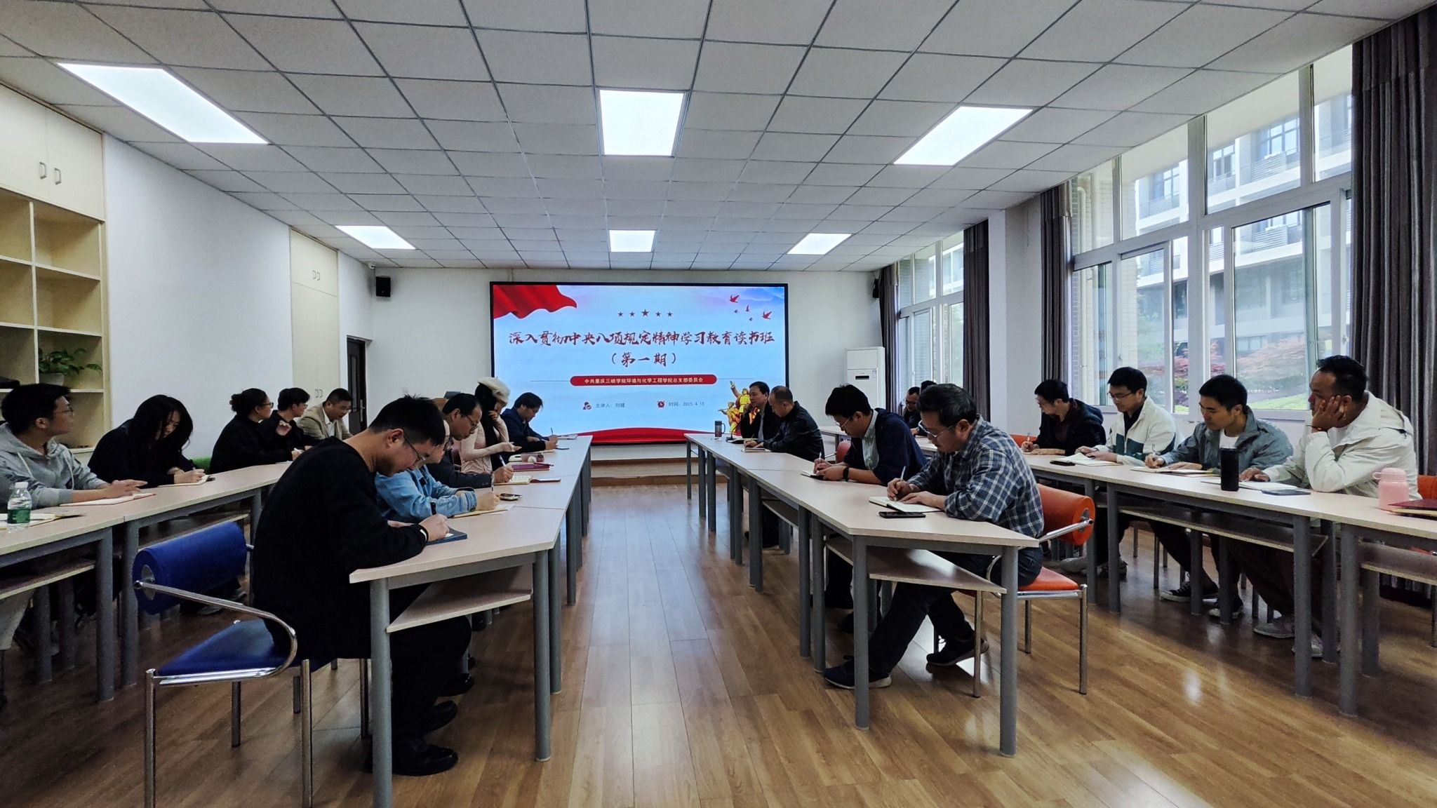 4月15日上午,环境与化学工程学院党总支在慎思楼4栋206举办深入贯彻中央八项规定精神学习教育读书班(第一期)。此次读书班旨在进一步加强学院党员干部的作风建设,提升政治素养和工作效能。学院班子成员、科级干部、党总支委员、各党支部书记和委员共计三十余人参加了此次活动。