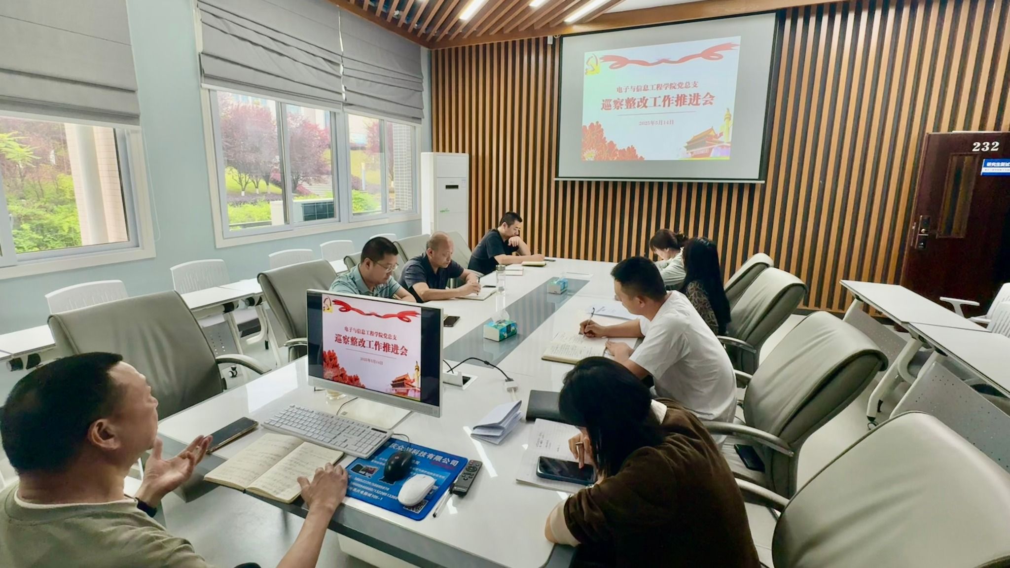 5月14日下午,电子与信息工程学院在慎思1栋232会议室召开巡察整改工作推进会,会议由党总支书记欧岚同志主持,党政领导班子成员、党总支委员、各党支部书记以及学工办主任参会。