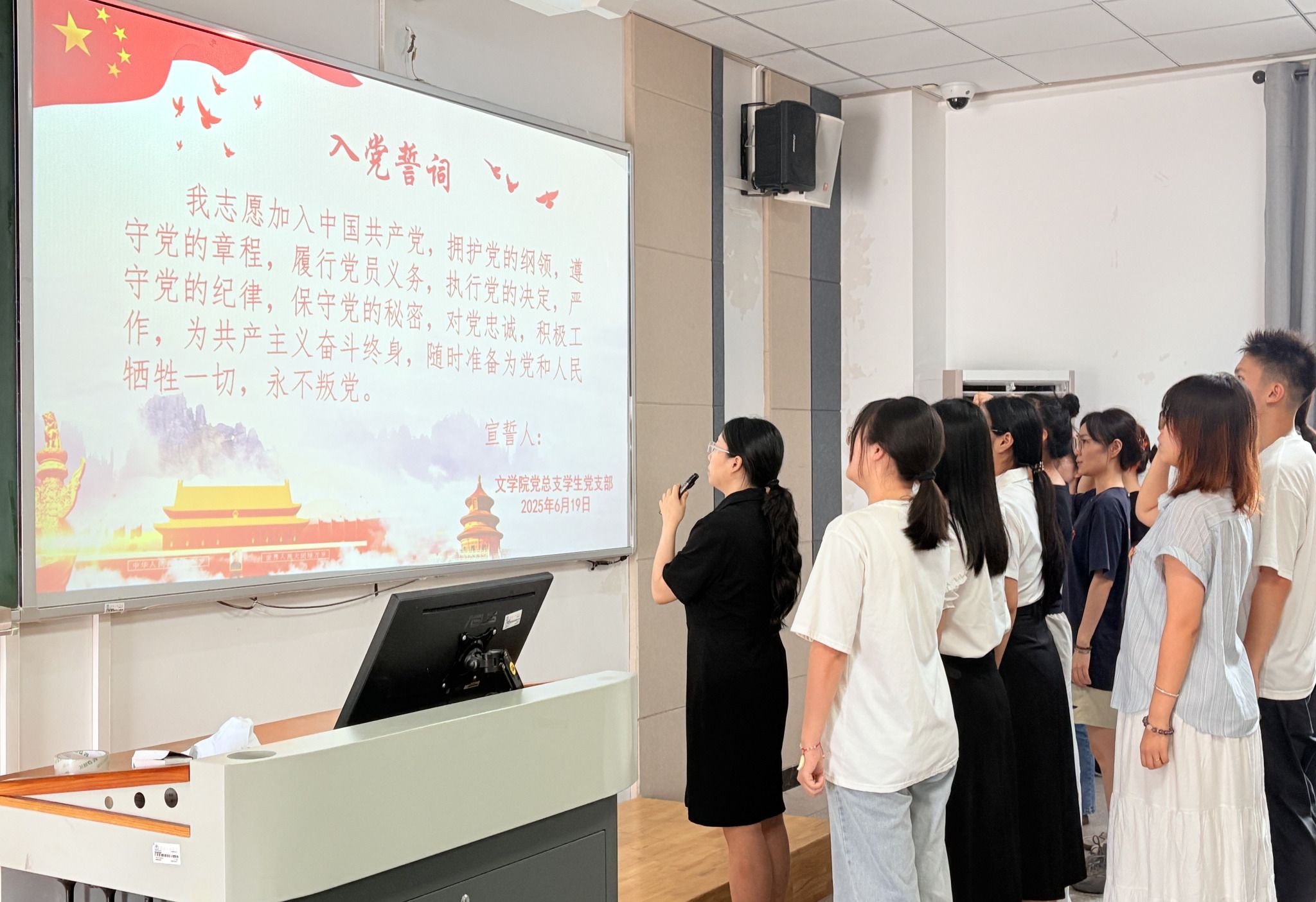 周子钦站于前方,右手握拳举过肩头,面向党旗,带领第18期预备党员重温入党誓词。她表示,今天新一批同志光荣加入中国共产党。从这一刻起,你们的肩上多了一份沉甸甸的责任。入党誓词的每一字、每一句,都凝结着共产党人的初心与使命。希望你们以优秀党员同志为榜样,主动学习党的理论,在实践中锤炼本领,用实际行动诠释“请党放心,强国有我”的青春誓言。