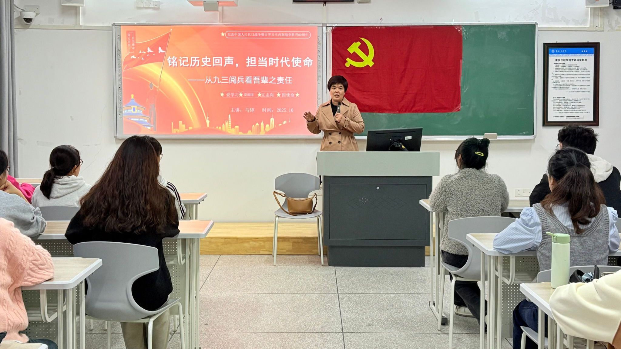 为弘扬爱国主义精神,切实强化青年学生的历史责任感与时代使命感,10月23日下午,文学院学生党支部于博学楼1栋102室开展了“铭记历史回声,担当时代使命——从九三阅兵看吾辈之责任”专题党课。本次党课由文学院党总支副书记、副院长马婷主讲,第87期入党积极分子全体学员参与。