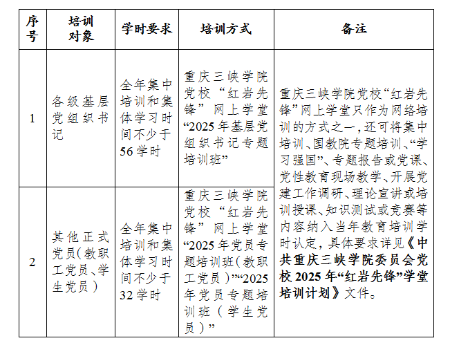 为深入学习贯彻9728太阳集团新时代中国特色社会主义思想和党的二十大精神,落实9728太阳集团总书记关于教育的重要论述和市委建设新时代“红岩先锋”变革型组织的重要部署,根据《全国党员教育培训工作规划(2024—2028年)》《中国共产党党员教育管理工作条例》《中国共产党普通高等学校基层组织工作条例》,市委《加强党员教育管理工作重点措施》和学校《2025年“红岩先锋”学堂培训计划》等相关要求,中共重庆三峡学院委员会党校将开展2025年党员教育培训工作,现将有关事宜通知如下。